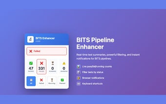 BITS Pipeline Enhancer는 개발자와 QA 엔지니어의 워크플로우를 최적화하기 위해 설계된 무료 Chrome 확장 프로그램으로, BITS(Backend Integration Testing System) 파이프라인 페이지에 주요 기능을 제공합니다. 실시간 요약 통계 및 고급 필터링 옵션과 같은 기능을 통해 사용자는 테스트 상태를 쉽게 추적할 수 있습니다. 이 확장 프로그램은 통과/실패 수에 빠르게 접근할 수 있도록 하며 효율적인 탐색을 위한 키보드 단축키를 지원합니다.